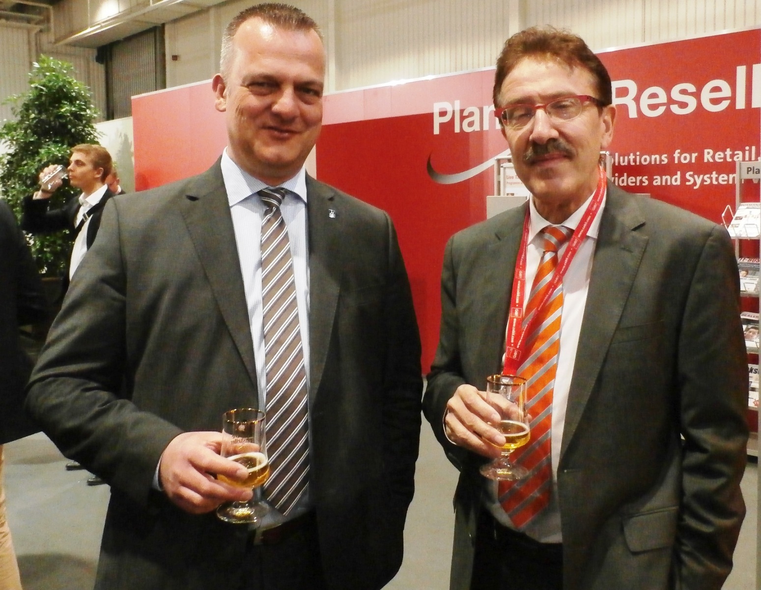 Kurzer Weg: Für die BVT (Bundesverband Technik des Einzelhandels) Funktionäre Joachim Dünkelmann (li.), stellvertretender Geschäftsführer und Geschäftsführer Willy Fischel war der Weg zur Ausstellerparty im Planet Reseller erfreulich kurz: Ihr Messebüro lag genau daneben