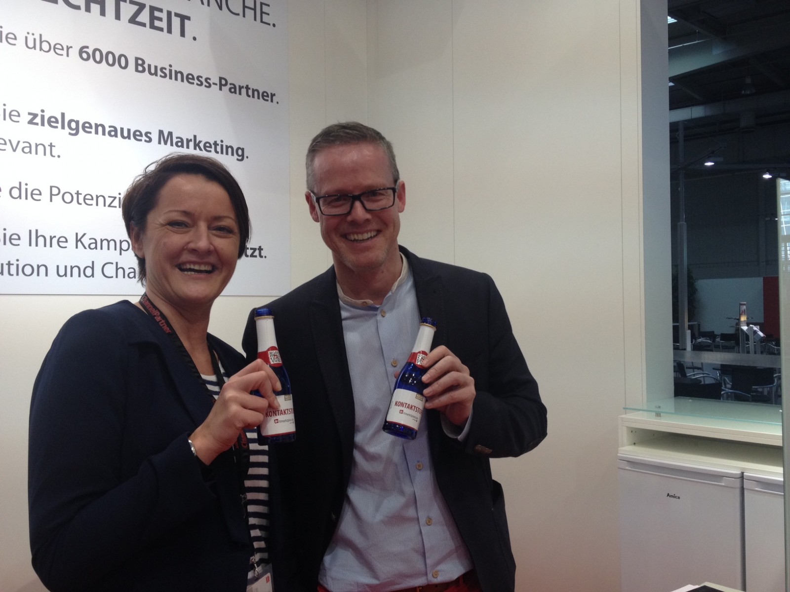 Nach dem Aufbau ein Proseccöchen: Bianca Kasper (Pies Full Media) und Andy Altmeyer (A Eins)