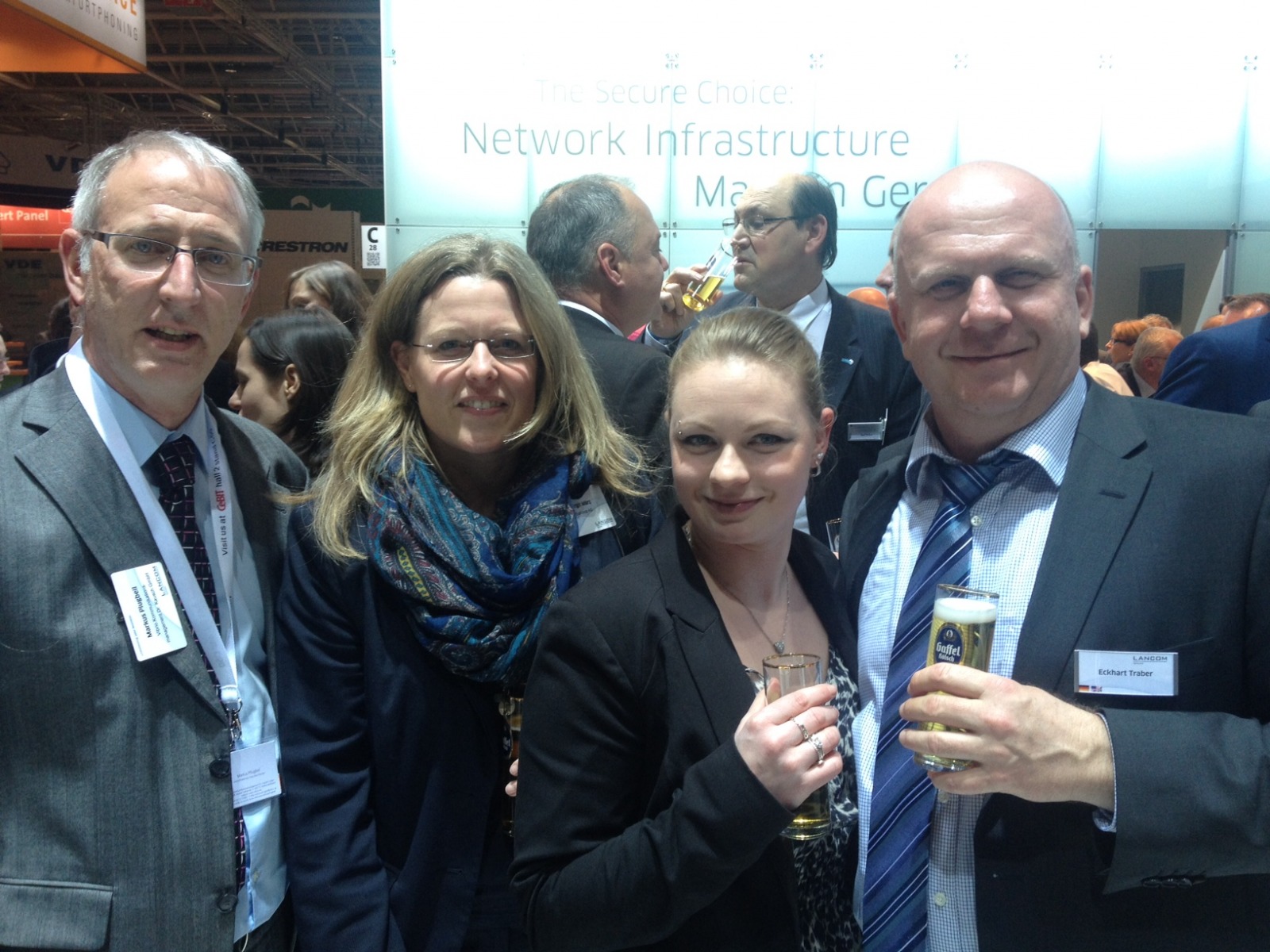 Bei Lancom war bei der Standparty kaum noch ein Platz zu ergattern: Markus Pflugbeil (Vibrio, links), Birgit März (Brainloop AG), Annika Pulver (Vibrio) und Eckhart Traber (Lancom)