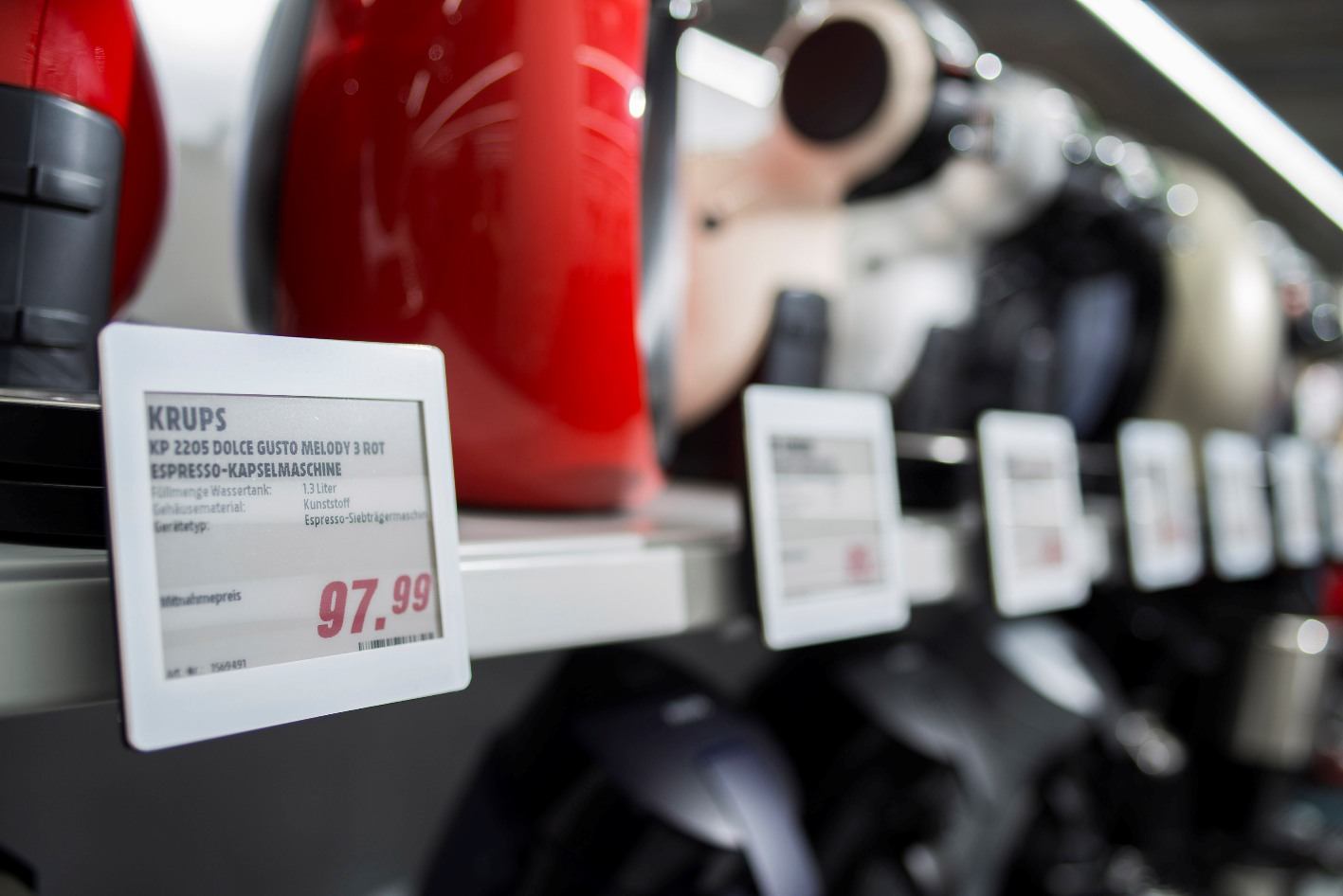 Elektronische Preisschilder können jederzeit über WLAN vom Warenwirtschaftssystem aus verändert werden; spart Zeit und Personal