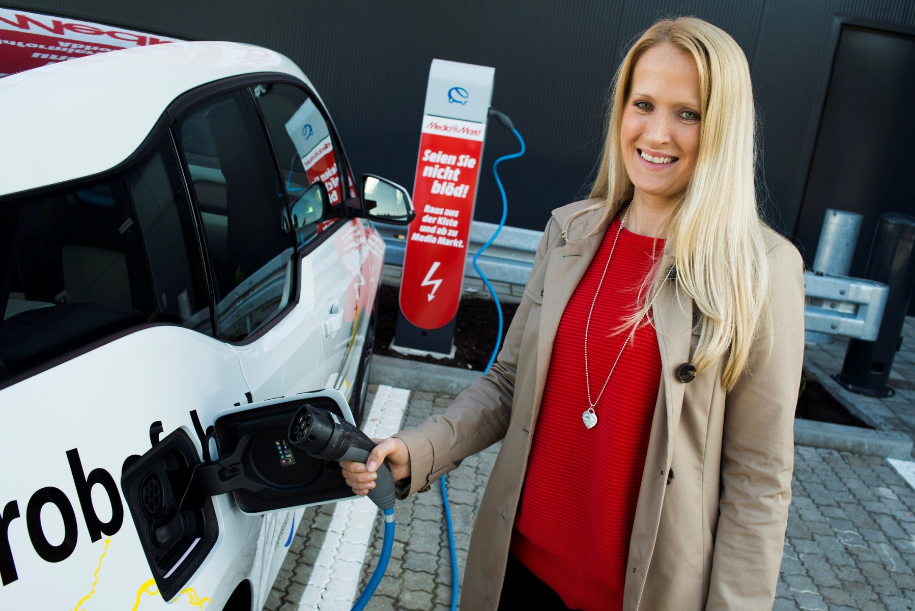 Einkaufen und dabei Strom tanken: Wenn schon Elektronikmarkt, dann auch zwei e-Tankstellen. Wenn die Zeit reicht, können Kunden ihr e-Fahrzeug auftanken; unabhängig vom Anschluss. Dafür gibt’s Adapter