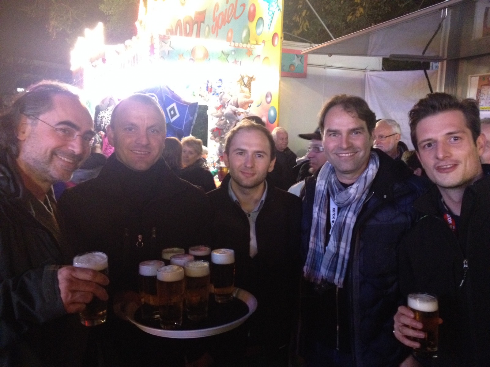 Alexander Bruchhage (Also) mit frischem Bier für Andreas Raum (Freyraum), Wladimir Konrad (Acer), Michael Frey (Freyraum) und Markus Beus (Acer, v.l.n.r.)