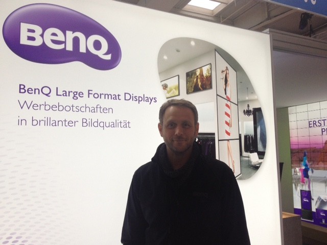 Guido Forsthövel, Marketing-Chef von BenQ, vor dem fertig aufgebauten Stand des Herstellers.