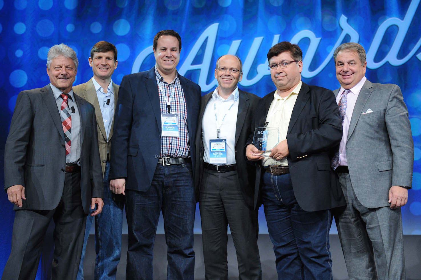 Belsoft Infortix AG nahm im Team den Preis Partner of the Year Schweiz von Karl Heinz Warum (links), Kris Hagerman (2.v.l.) und Mike Valentine (rechts) entgegen: Simon Häni (3.v.l.), Urs Bühler (3.v.r.) und Bruno Gujer (2.v.r).