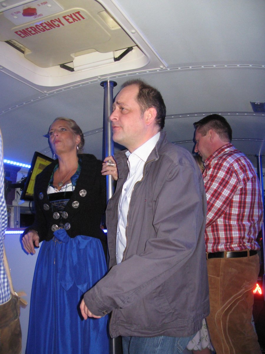 Das Tanzbein im Bus schwingen hier die MCE-ETV-Manager Melanie Holländer und Bernd Bramboeck sowie LG-Marketingleiter Frank Sander.