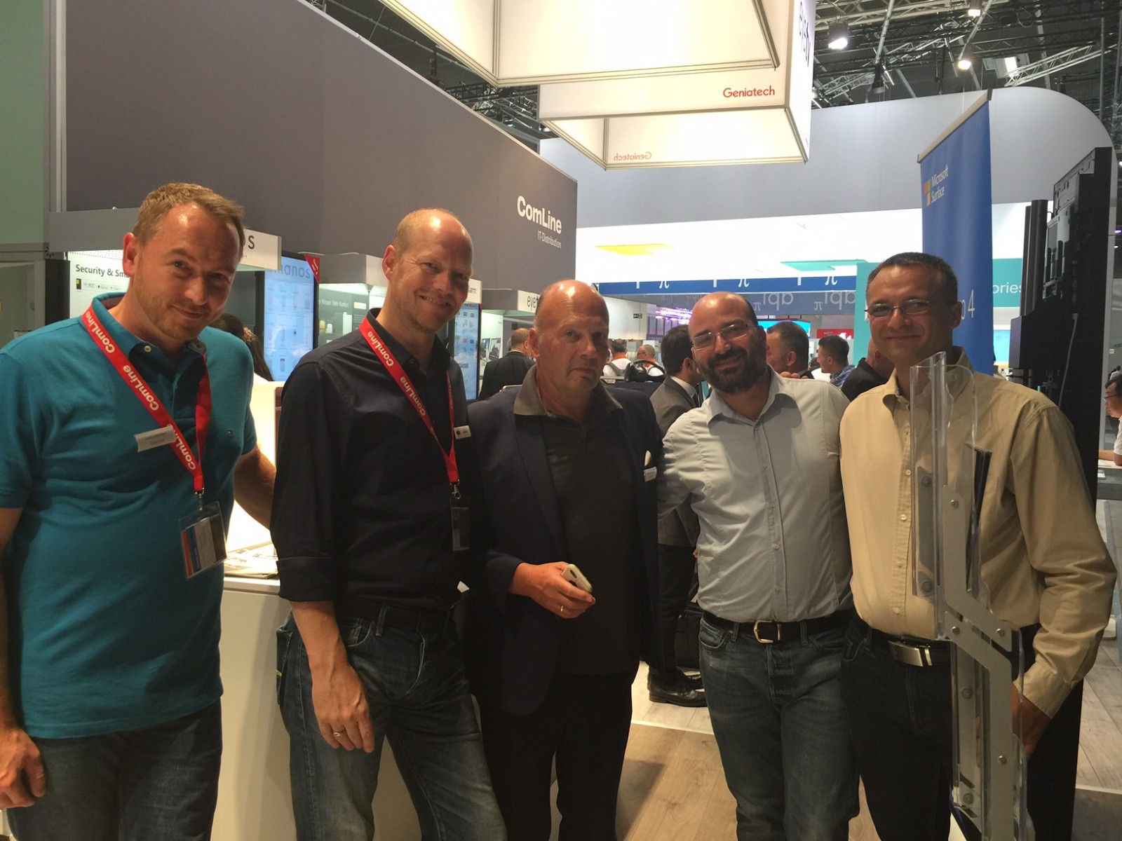 Gruppenbild ohne Dame: Unter anderem mit Lars Lorenzen und John Voss (beide ComLine) und Evangelos Pakos (notebook.de)