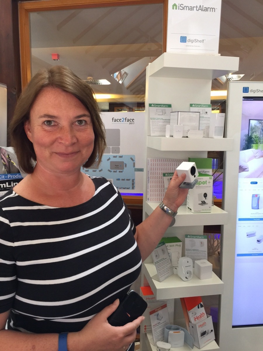 Ilona Maas mit der Kamera Spot+. Die iSmart-Produkte werden exklusiv über ComLine vertrieben