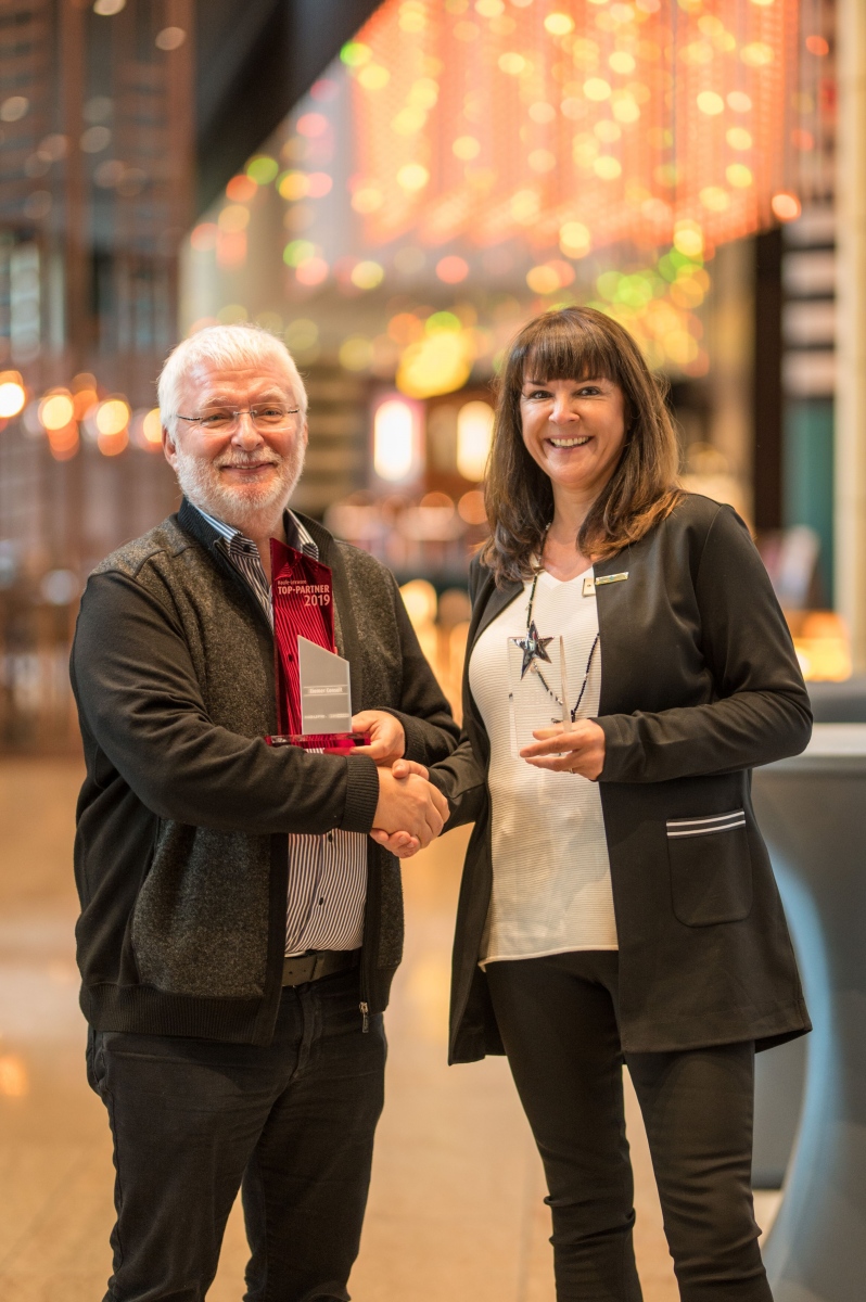 Michael Ziemer, der Gewinner des diesjährigen Lexware-Partner-Awards, erhält den Preis von Diana Bonarius, Director Sales für Software und IT-Channels bei Lexware