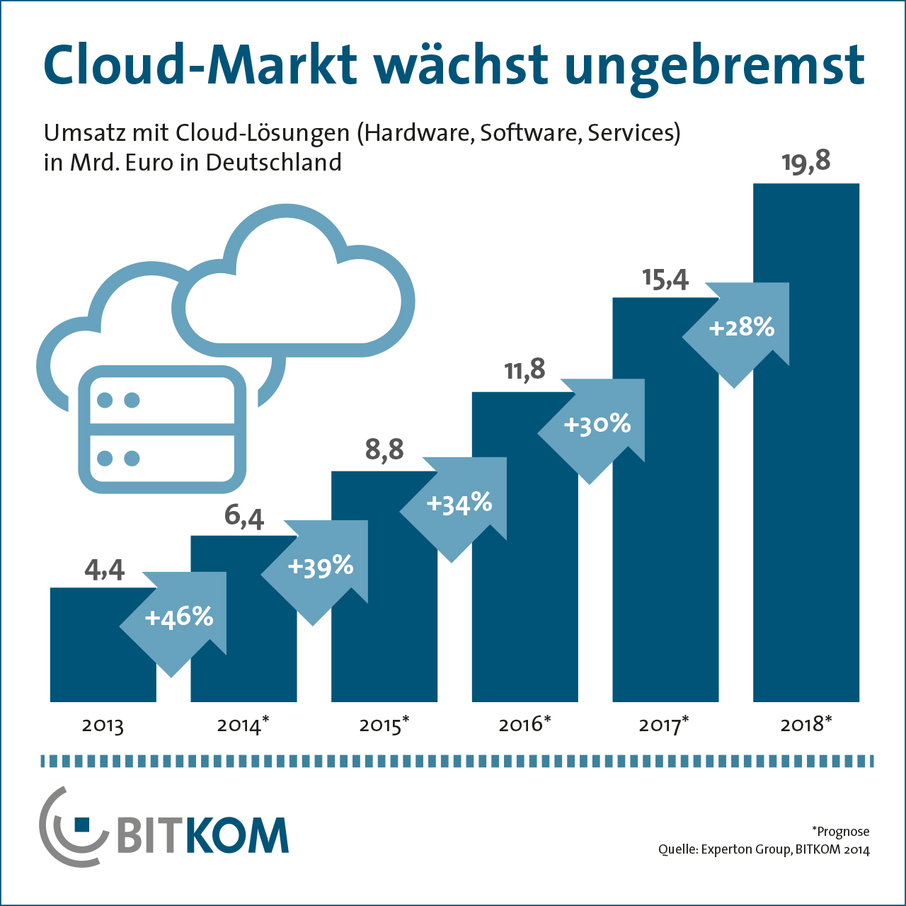 Deutscher Markt für Cloud Computing wächst rasantDer Markt für Cloud Computing mit Geschäftskunden wird in Deutschland im laufenden Jahr um 46 Prozent auf rund 6,4 Milliarden Euro wachsen, so eine Bitkom-Studie. Damit bleibt das Wachstum etwas unter den Erwartungen. Ursprünglich war von einem Umsatzanstieg von 50 Prozent auf 6,9 Milliarden Euro ausgegangen. Die NSA-Affäre habe das Wachstum des Cloud-Marktes geringfügig gebremst. Einige Kunden hätten Projekte auf Eis gelegt oder sich stattdessen für eine Lösung ohne Cloud entschieden. Bis zum Jahr 2018 soll das Volumen des Cloud-Marktes im Business-Bereich in Deutschland mit jährlichen Wachstumsraten von durchschnittlich 35 Prozent den Prognosen zufolge auf rund 19,8 Milliarden Euro steigen.