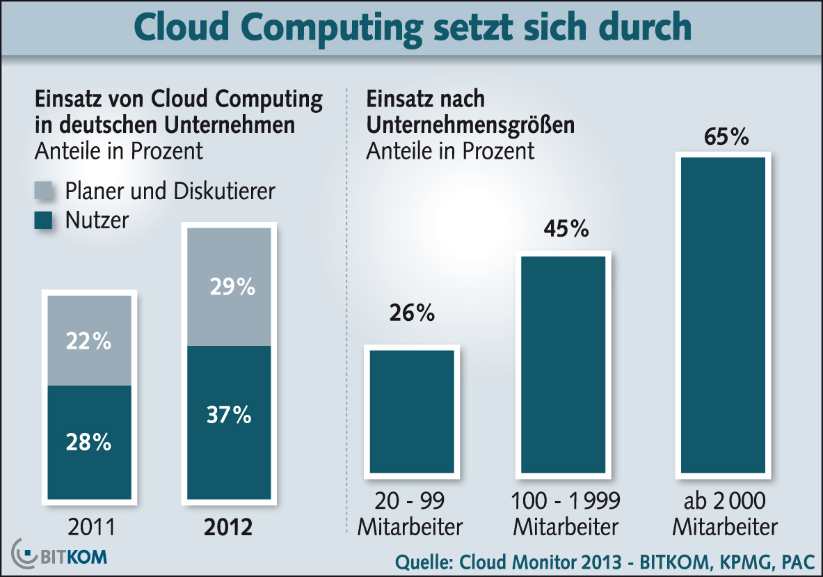 In 2012 hat gut ein Drittel (37 Prozent) aller Unternehmen in Deutschland Cloud Computing eingesetzt. Das hat eine repräsentative Umfrage des Bitkom und der Wirtschaftsprüfungs- und Beratungsgesellschaft KPMG ergeben. Im Vergleich zum Vorjahr entspricht das einem Anstieg von 9 Prozentpunkten. Weitere 29 Prozent planten den Einsatz konkret oder diskutierten ihn. Für ein Drittel der befragten Unternehmen war Cloud Computing kein Thema. Bereits fast zwei Drittel (65 Prozent) der Großunternehmen ab 2.000 Mitarbeitern setzen auf die Cloud, im Mittelstand mit 100 bis 1.999 Mitarbeitern war es mit 45 Prozent fast die Hälfte. Bei kleineren Unternehmen mit 20 bis 99 Beschäftigten lag der Anteil dagegen nur bei einem Viertel. ?