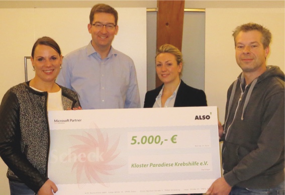 Der Broadliner spendete für jeden Neukunden, der im Rahmen dieser Aktion Microsoft Software gekauft hatte, zehn Euro an den gemeinnützigen Verein Kloster Paradiese Krebshilfe. Die Aktion war so erfolgreich, dass in der vergangenen Woche eine Spendensumme in Höhe von 5.000 Euro übergeben werden konnte. Katharina Böcher, Vorstandsvorsitzende Kloster Paradiese Krebshilfe, hat den Scheck jetzt freudig entgegen genommen: „Wir bedanken uns bei Also für diese großartige Spendenaktion und sind überwältigt, dass eine so hohe Summe zustande gekommen ist.“