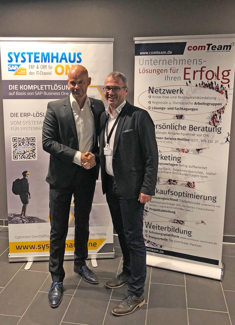 Sven Glatter (l.) und Thomas Neumeier freuen sich auf ihre ZusammenarbeitThomas Neumeier, Inhaber der Neumeier AG, und Sven Glatter, Geschäftsführer comTeam, haben eine umfangreiche Zusammenarbeit angekündigt: Im Mittelpunkt steht die gemeinsame Vermarktung einer SAP-basierten Warenwirtschaftslösung für Systemhäuser und Partner im Channel. Die «comTeam Teamsolution 3» geht in der «Systemhaus.One» der Neumeier AG auf. Beide Lösungen basieren auf SAP Business One. Thomas Neumeier und sein Team sollen den Vertrieb, die Betreuung und die ständige Weiterentwicklung der ERP-Lösung innerhalb der comTeam übernehmen. Um nah an den comTeam-Partnern zu sein, wird Neumeier gleichzeitig Mitglied in dem Systemhaus-Netzwerk.