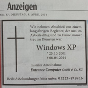 Die Entrance Computer aus Hiddenhausen schaltete heute pünktlich zum Support-Ende in der Lokalpresse eine XP-Traueranzeige. Die Telefone stehen seitdem nicht mehr still.
