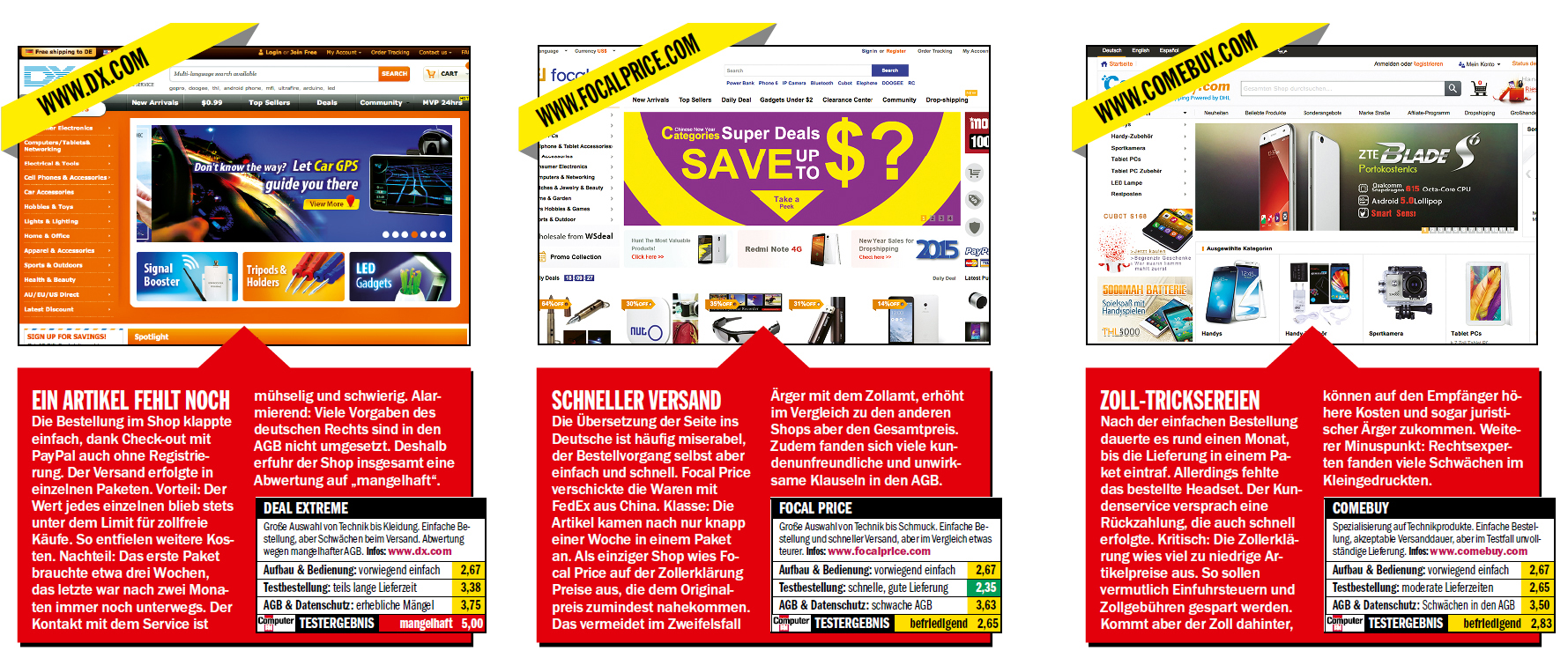 Konkurrent Focalprice.com punktete hingegen mit einem schnellen Versand der Waren aus China per FedEx. Nach nur knapp einer Woche kamen die Produkte in einem Paket an – der Spitzenwert des Checks. Außerdem positiv: «Als einziger Shop wies Focalprice.com auf der Zollerklärung Preise aus, die dem Originalpreis zumindest nahekommen. Das vermeidet im Zweifelsfall Ärger mit dem Zollamt», so Bruns weiter. Die Internetpräsenzen der Shops wurden im Test ohnehin größtenteils als verbraucherunfreundlich eingestuft. Ein weiteres Ergebnis: Nicht jeder Anbieter war bei seinen Zollpraktiken so ehrlich und transparent wie Focalprice.com. «Die Zollerklärung von comebuy.com wies zum Beispiel viel zu niedrige Artikelpreise aus. So sollen vermutlich Einfuhrsteuern und Zollgebühren gespart werden», erklärt Bruns. Das Risiko, erwischt zu werden, trägt dabei auch der Käufer: «Kommt der Zoll dahinter, können auf den Empfänger höhere Kosten und sogar juristischer Ärger zukommen.»