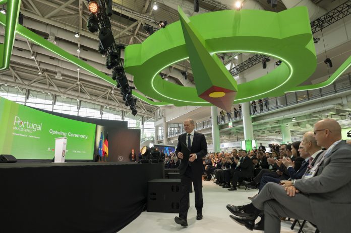 Auch die Wiederverwendung von Materialien wird in vielen Bereichen wichtiger. Bei der gemeinsamen Tour mit António Costa, dem Premier des diesjährigen Messe-Partnerlands Portugal, posierte Scholz kurz vor einem Fahrrad, das ganz aus recyceltem Kunststoff besteht.