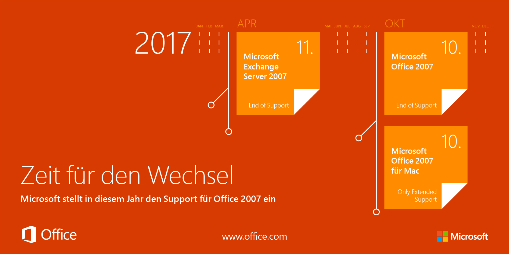 Microsoft wies am Freitag in einer Mitteilung darauf hin, dass die letzten Tage des Supports der Office-2007-Familie angebrochen sind: Am 11. April 2017 endet rund zehn Jahre nach dem Launch der Lebenszyklus von Exchange Server 2007. Am 10. Oktober 2017 folgen Office 2007, Project und Project Server 2007, Visio 2007 sowie SharePoint Server 2007. Microsoft empfiehlt Kunden mit den genannten Versionen angesichts des kommenden Support-Endes, die Migration auf Office 365 zu evaluieren. Für On-Premise-Produkte, also Produkte, die lokal auf Rechnern und in firmeneigenen Netzwerken installiert werden, gilt ein zehnjähriger Lebenszyklus. In den ersten fünf Jahren dieser Zeitspanne bietet Microsoft seinen Kunden einen sogenannten «Mainstream-Support», danach für Kunden mit Software Assurance einen fünfjährigen «Extended Support». Nach Ablauf des Supports stellt Microsoft keine Performance-, Kompatibilitäts- und Sicherheits-Updates wie Patches und Hotfixes mehr zur Verfügung.