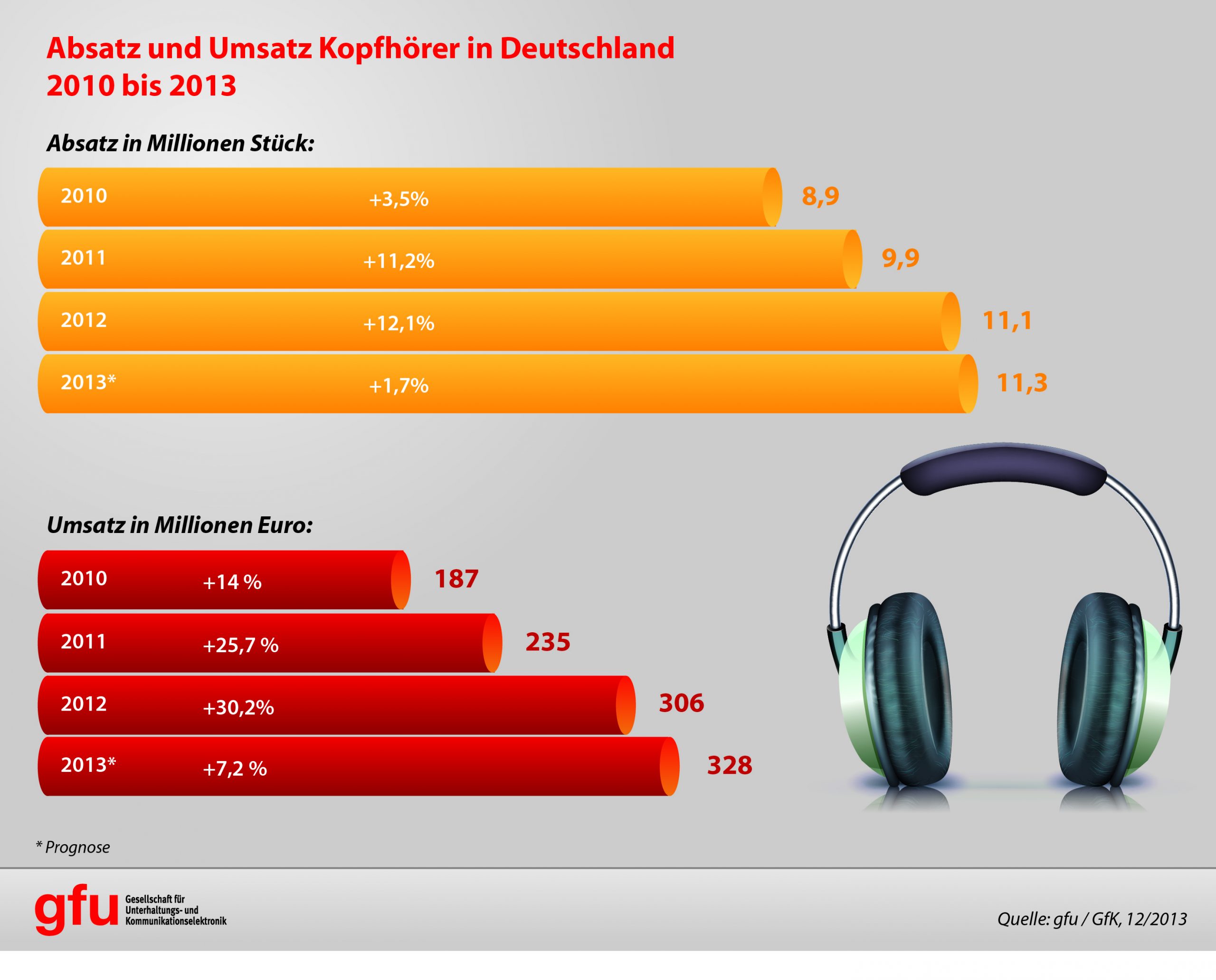Der Grund für den Rückgang: Das Abspielen von MP 3-Dateien ist inzwischen mit einer Vielzahl von Geräten möglich. Egal, ob Mobiltelefone, Smartphones, Tablet-PCs, Notebooks, Autoradios oder portable Navigationsgeräte, ein MP 3-Player ist integriert. Neben der Marktsättigung ist dieser vielfältige Einsatz der Technologie in unterschiedlichsten Geräten ein Grund für den Absatzrückgang. Dennoch sorgt die Verbreitung der MP3-Wiedergabe in vielen Produktbereichen für die erfolgreiche Entwicklung anderer Marktsegmente: So stieg der Absatz von Kopfhörern in den letzten Jahren kontinuierlich auf mehr als 11,3 Millionen Stück (+ 2 %, Prognose für 2013) und einen Umsatz von über 300 Millionen Euro (+ 7 %, Prognose für 2013). Dockingstations, Geräte zur Audio-Wiedergabe mit Anschluss für MP 3-Player oder Smartphones, werden in diesem Jahr erstmals die Millionenmarke übertreffen (+ 30 %) und rund 120 Millionen Euro (+ 27 %) Umsatz generieren, so die gfu.