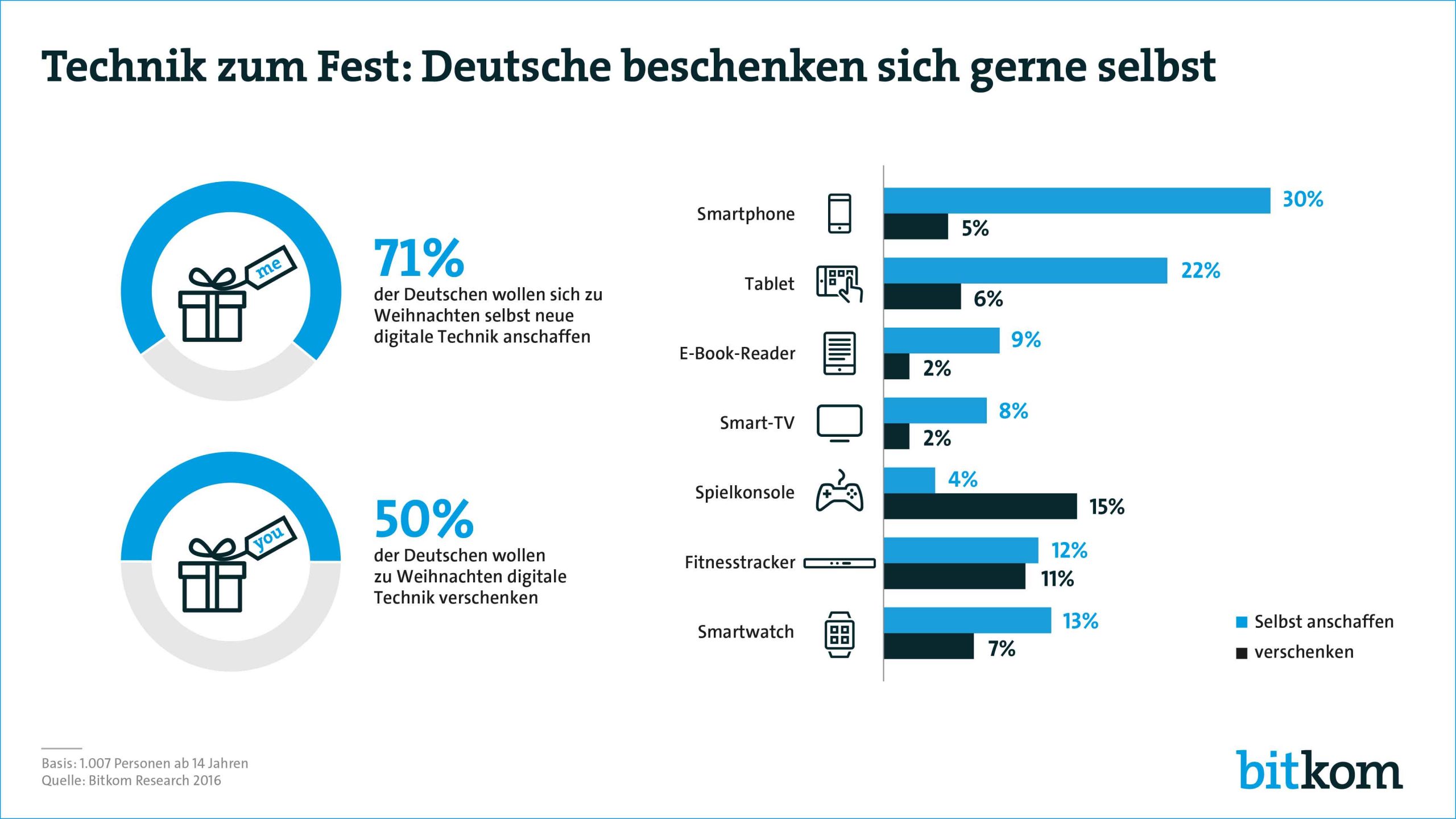 Im Bereich der klassischen Unterhaltungselektronik ist vor allem das Smart-TV gefragt. Seit Jahren ein Klassiker unter den Geschenken ist die Spielkonsole: Jeder sechste Bundesbürger (15 Prozent) will in diesem Jahr eine Konsole verschenken, 4 Prozent möchten sich selbst eine kaufen. Sowohl als Präsent, als auch für den Eigenbedarf beliebt sind Fitnesstracker und Smartwatches. Jeder Achte (12 Prozent) will das Fest zum Anlass nehmen, sich selbst einen Fitnesstracker zu kaufen, jeder Neunte (11 Prozent) möchte einen an Freunde oder Familienmitglieder verschenken. Eine Smartwatch soll für jeden Siebten (13 Prozent) unterm eigenen Baum landen, 7 Prozent möchten eine verschenken.