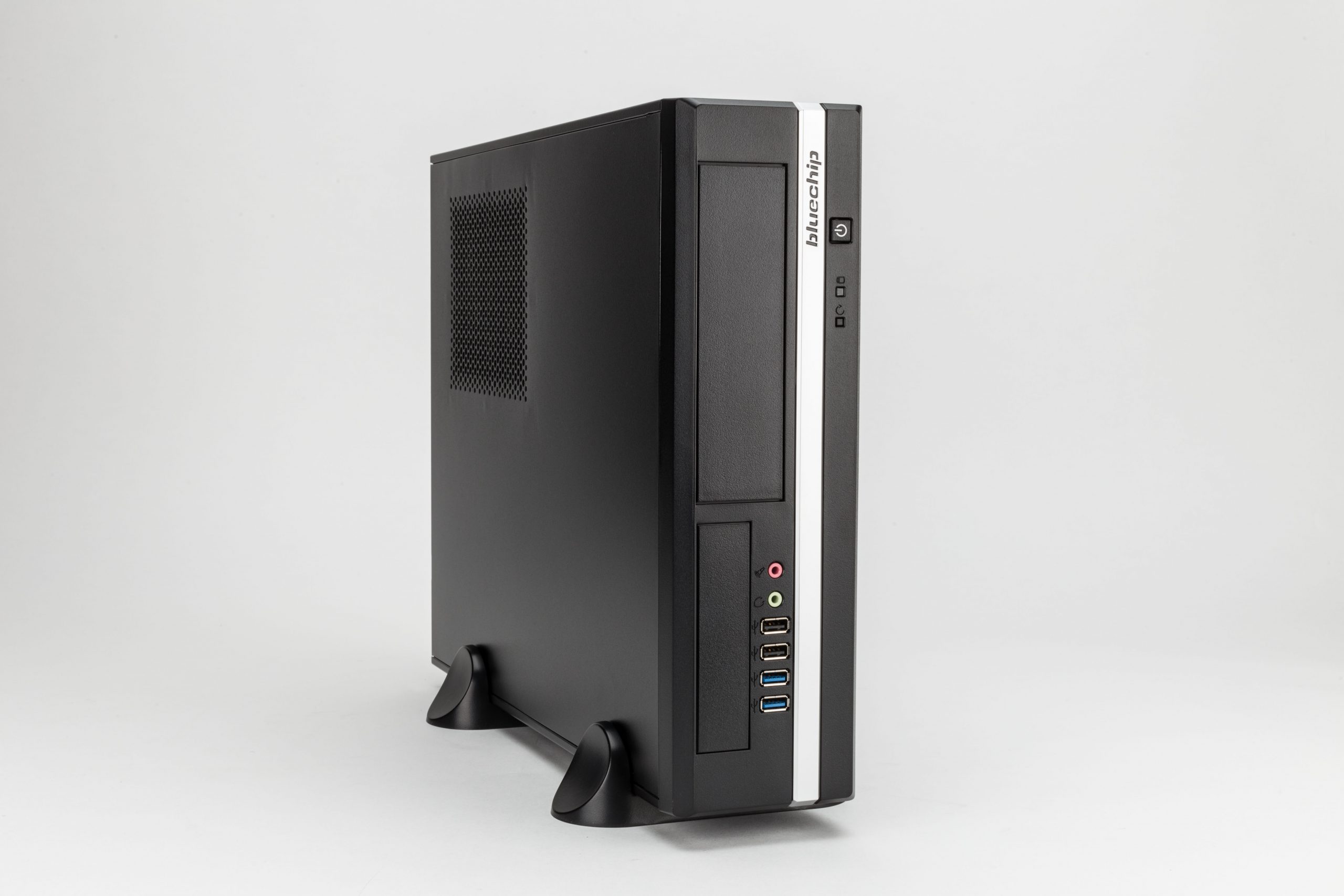 Alle Gehäuse verfügen über Sicherheitsmerkmale wie Padlook Loop, Kensington Slot und Chassis Intrusion Switch. An der Frontseite stehen zwei USB 3.0, zwei USB 2.0 sowie jeweils ein Kopfhörer- und Mikrofon-Anschluss zur Verfügung. Das beleuchtete Bluechip-Logo an der Gehäusefront dient gleichzeitig als Power-LED. In beiden Towern lassen sich eine weitere SSD ohne Verwendung eines zusätzlichen Rahmens am Gehäuseboden installieren. Somit lassen sich insgesamt fünf Festplatten oder SSDs verbauen. Alle Gehäuse sind komplett GS- und CE-konform.