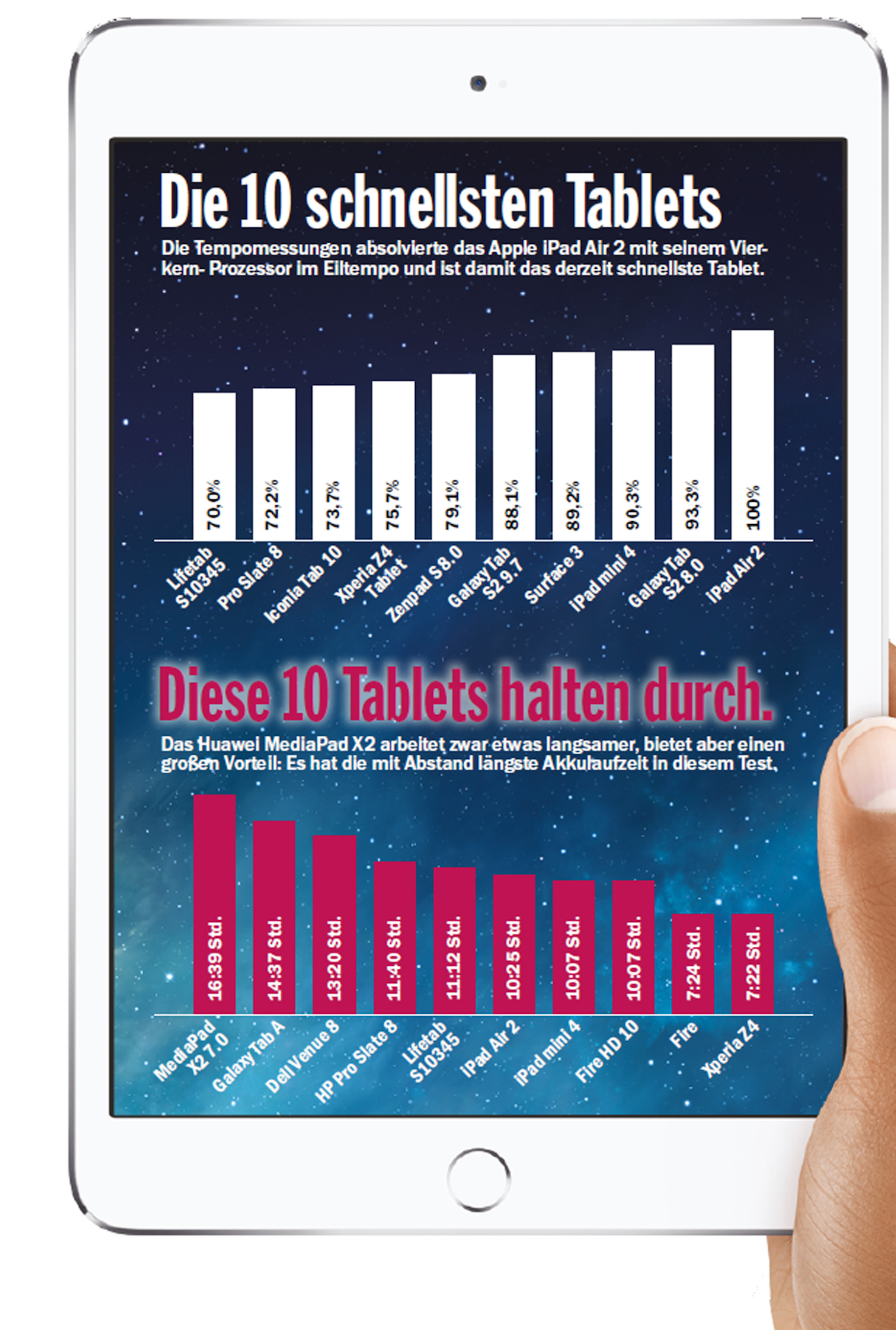 Das iPad Air 2 war das schnellste Tablet im Test. Bei der längsten Akkulaufzeit hingegen ist das Huawei MediaPad X2 Spitzenreiter. (Quelle: obs/COMPUTER BILD)Amazon, Samsung, Apple und Co. bieten mittlerweile eine große Anzahl an Tablets an. Computer BILD hat 16 Tablets getestet: Insgesamt standen acht Modelle mit Displays zwischen 7 und 8 Zoll sowie acht weitere Tablets mit 10-Zoll-Bildschirmen auf dem Prüfstand. Die Preisspanne der Tablets reichte von 60 bis 720 Euro. «Bei den kleinen Tablets ist das iPad mini 4 und bei den größeren Geräten das iPad Air 2 das Maß aller Dinge: Verarbeitung, Bedienung und Ausstattung sind einfach top», so Redakteur Ingolf Leschke. In der Kategorie «Display» konnten Huawei, Sony und Samsung mit dem MediaPad X2 7.0, Xperia Z4 und den beiden Galaxy Tab S2 punkten: Die Wiedergabe sei gestochen scharf und auch die Farbdarstellung überzeuge, so die Tester. Allerdings: Keiner der Testkandidaten würde an die Bildschirmqualität der Apple-Geräte herankommen.