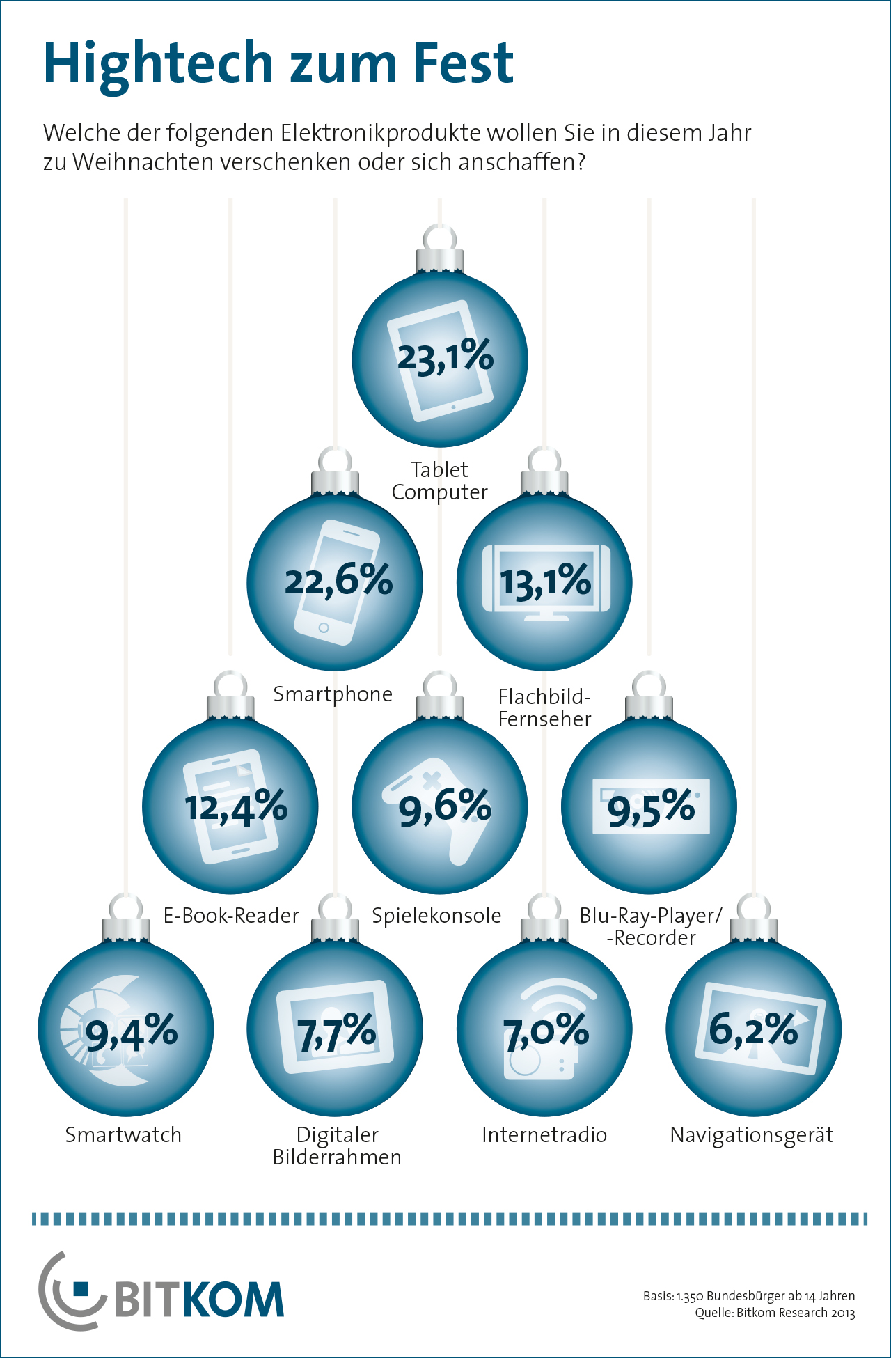 Insgesamt planen 70 Prozent der Bundesbürger, Computer, Unterhaltungselektronik, Mobilgeräte und Co. zu Weihnachten zu verschenken oder sich selbst anzuschaffen. Bei den 14- bis 29-Jährigen sind es sogar drei Viertel (78 Prozent). Zum Vergleich: Im vergangenen Jahr wollten erst 62 Prozent aller Bundesbürger ITK-Geräte zum Fest kaufen und im Jahr 2009 sogar nur 40 Prozent. Im Ranking der beliebtesten Hightech-Käufe zu Weihnachten liegen Flachbildfernseher mit 13 Prozent auf Platz drei. Weitere begehrte Weihnachtsgeschenke sind E-Book-Reader. Rund jeder achte Bundesbürger (12 Prozent) möchte sich ein solches Gerät zum Fest zulegen. Auch Spielkonsolen (10 Prozent) gehören wieder zu den beliebtesten Produkten zu Weihnachten. Immerhin 9 Prozent der Bundesbürger wollen eine Smartwatch verschenken oder sich selbst zu Weihnachten besorgen. „Die intelligenten Uhren gehören zum ersten Mal zu den begehrtesten Geschenken“, so Bitkom-Präsident Dieter Kempf. Viele Modelle wurden erst in diesem Jahr vorgestellt. In der Regel lassen sie sich kabellos mit dem Smartphone verbinden. Dadurch zeigt die Uhr eingehende Anrufe, SMS und E-Mails an – das Smartphone selbst kann dabei in der Tasche bleiben. Zu einer etwas pessimistischeren Einschätzung kam das Marktforschungsinstitut Gartner, das prognostizierte, dass Smart Watches im diesjährigen Weihnachtsgeschäft keine Rolle spielen würden.
