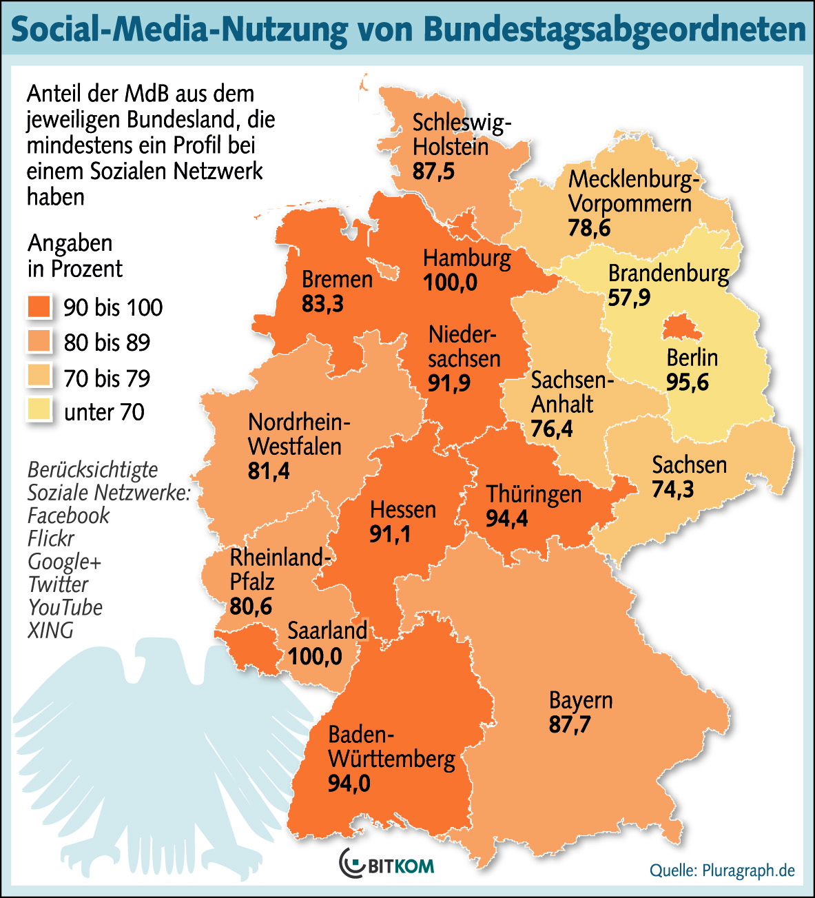 In diesen Bundesländern verweigern die Politiker Social MediaDie Abgeordneten des Bundestages setzen auf Twitter & Co.: 8 von10 Politikern haben mindestens ein Profil bei einem Sozialen Netzwerk wie Facebook, Twitter oder Google+. Allerdings gibt es deutliche Unterschiede zwischen den Bundesländern. Am aktivsten sind die Bundestagsabgeordneten aus dem Saarland und Hamburg, von denen alle mit entsprechenden Seiten oder Profilen im Netz vertreten sind. Auf Platz drei folgen die MdB aus Berlin. Besonders zurückhaltend sind die Politiker aus Sachsen-Anhalt und Sachsen, von denen rund ein Viertel komplett ohne Social-Media-Nutzung auskommt. Mit weitem Abstand Schlusslicht sind die Abgeordneten aus Brandenburg. Fast jeder Zweite (42 Prozent) verzichtet hier auf Social-Media-Kontakte mit den Bürgern, so eine Auswertung der Social-Media-Analyse-Plattform Pluragraph.de für den Bitkom.
