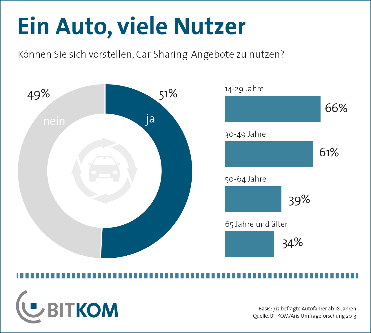 Car-Sharing liegt im Trend: Jeder zweite Autofahrer kann sich vorstellen, solche Angebote zu nutzen Bei den unter 30-Jährigen sind es sogar zwei Drittel, in der Altersgruppe zwischen 30 und 49 Jahre über 60 Prozent. Das ergab eine repräsentative Umfrage unter Autofahrern im Auftrag des Birkom. „Car Sharing ist ein exzellentes Beispiel, wie IT-Technologien innovative Geschäftsmodelle in anderen Branchen ermöglichen“, so Martina Koederitz vom Bitkom-Präsidium.