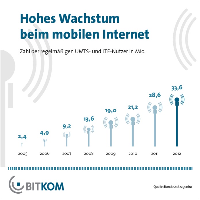 Anfang 2013 nutzten fast 34 Millionen Deutsche die Mobilfunkstandards der dritten und vierten Generation, UMTS und LTE. Das waren 5 Millionen oder 17 Prozent mehr als im Jahr zuvor.