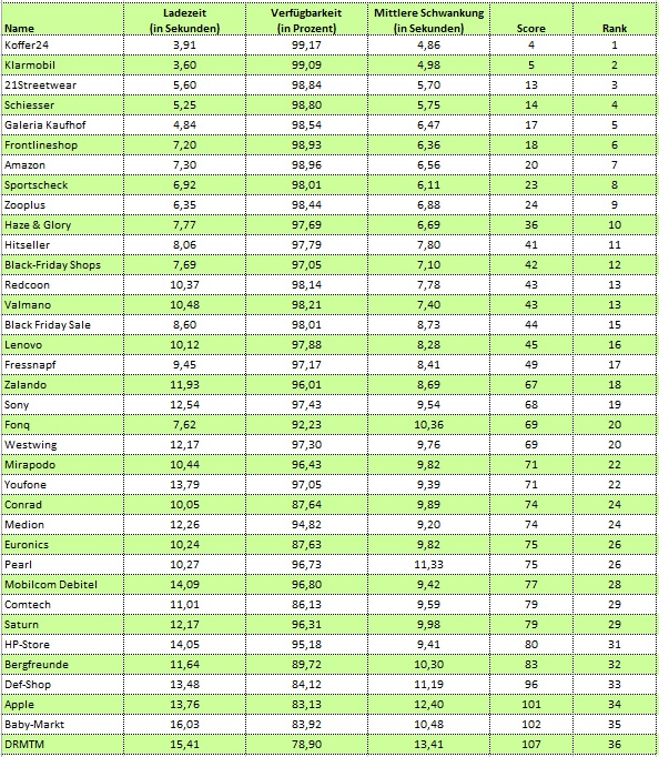 Am kundenfreundlichsten präsentierten sich Klarmobil und Koffer24 mit einer durchschnittlichen Ladezeit zwischen 3,6 und 3,9 Sekunden, bei rund 99prozentiger Verfügbarkeit. Abgesehen von einigen kleinen Ausreißern lieferte der Unterwäsche-Hersteller Schiesser mit rund 5 Sekunden ebenfalls eine vertretbare Performance. Viel mehr Geduld mussten Online-Shopper auf der Webseite von Sony oder Saturn aufbringen, sie warteten oft bis zu 12 Sekunden auf die Anzeige der Angebote. Schlusslicht ist der Modeanbieter DRMTM mit einer durchschnittlichen Ladezeit von mehr als 15 Sekunden und einer Verfügbarkeit von lediglich 78,9 Prozent (siehe Grafik).