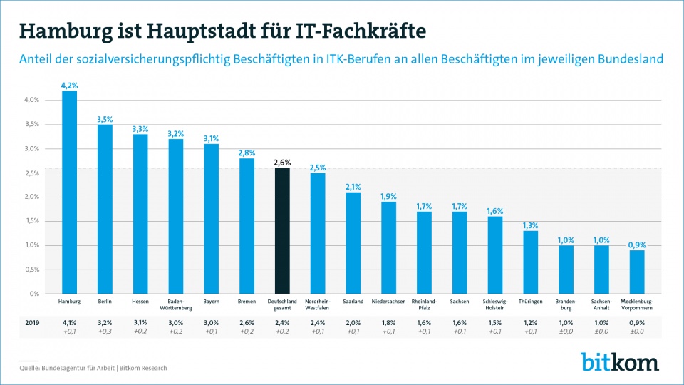 Sie sind zukunftssicher, lukrativ und gefragt: Immer mehr Jobs drehen sich um IT. Bundesweit kommen auf 100.000 sozialversicherungspflichtig Beschäftigte 2.600 IT-Experten. Tendenz: steigend. Im Vorjahr waren es erst 2.400. Im Ländervergleich haben Hamburg, Berlin und Hessen die höchsten Anteile an IT-Experten, so eine Bitkom-Studie. «In allen Branchen sind Unternehmen auf IT-Spezialisten angewiesen. Das gilt umso mehr angesichts der Corona-Krise, in der die Defizite in der Digitalisierung auch in der Wirtschaft schonungslos offengelegt wurden», sagt Bitkom-Präsident Achim Berg. Hamburg ist das Bundesland mit der größten Dichte an IT-Spezialisten. Im hanseatischen Stadtstaat arbeiten 4,2 Prozent aller sozialversicherungspflichtig Beschäftigten als Informatiker oder in anderen ITK-Berufen, das sind 0,1 Prozentpunkte mehr als im Vorjahr und entspricht 4.200 IT-Jobs pro 100.000 Beschäftigte.