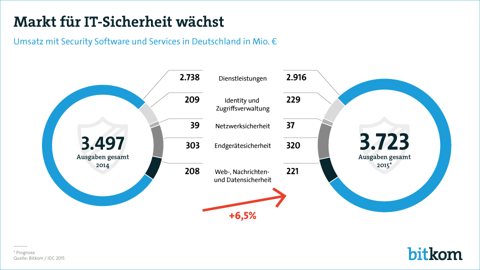 Der Umsatz mit Software und Services rund um IT-Security in Deutschland wird im laufenden Jahr voraussichtlich um 6,5 Prozent auf 3,7 Milliarden Euro wachsen, so eine Prognose von IDC und Bitkom. Der Markt für IT-Sicherheit legt damit stärker zu als der Gesamtmarkt für Software und IT-Services, der im Jahr 2015 in Deutschland voraussichtlich um 4 Prozent wachsen wird. Gut drei Viertel (78 Prozent) des Umsatzes im Bereich IT-Sicherheit entfallen auf Dienstleistungen wie Beratung, Implementierung und Wartung, knapp ein Viertel auf spezielle Anwendungen wie Endgerätesicherheit, Zugriffsverwaltung oder Netzwerksicherheit. «Die immer neuen Fälle von Hackerangriffen und Behördenzugriffen zeigen Wirkung: Das Bewusstsein für IT-Sicherheit bei Unternehmen und Privatanwendern ist gestiegen», so Bitkom-Hauptgeschäftsführer Bernhard Rohleder. Das führe zu wachsenden Ausgaben für die Sicherung von Geräten und Netzen, um Angriffe abzuwehren und sensible Daten zu schützen.